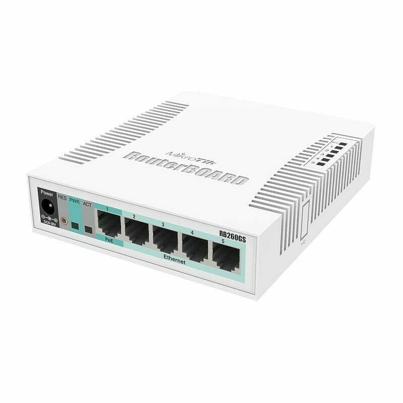 The RB260GS is a small SOHO switch. It has five Gigabit Ethernet ports and one SFP cage powered by an Atheros Switch Chip.